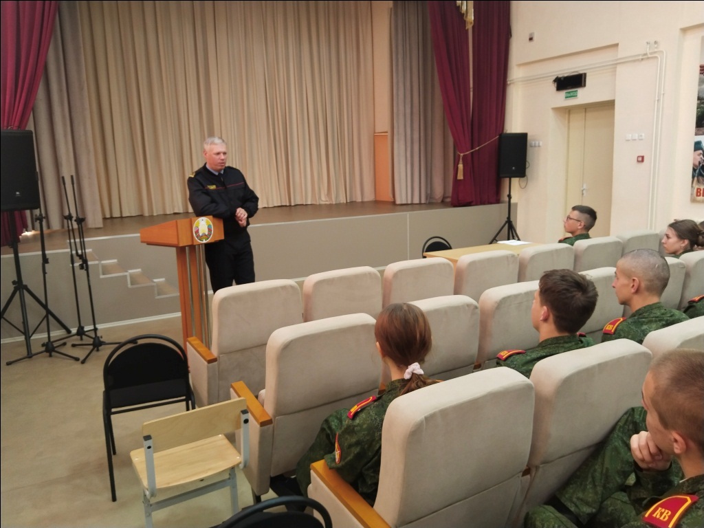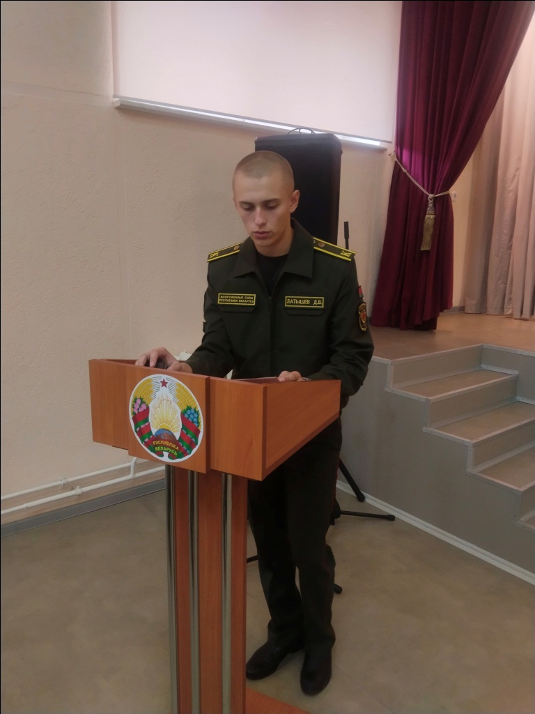 Перед кадетами выступили полковник Рожко Н.В., преподаватель УО «Военная академия Республики Беларусь», полковник милиции Кессель Т.Б., заместитель начальника управления по идеологической работе и кадровому обеспечению УВД Администрации Советского района по г.Минску, курсант 1 курса Латышев Дмитрий, представляющий военно-технический факультет БНТУ. Стоит отметить, что Латышев Дмитрий является выпускником Борисовского кадетского училища. Он рассказал учащимся о своей учебе, о требованиях, которые предъявляют в ВУЗе.