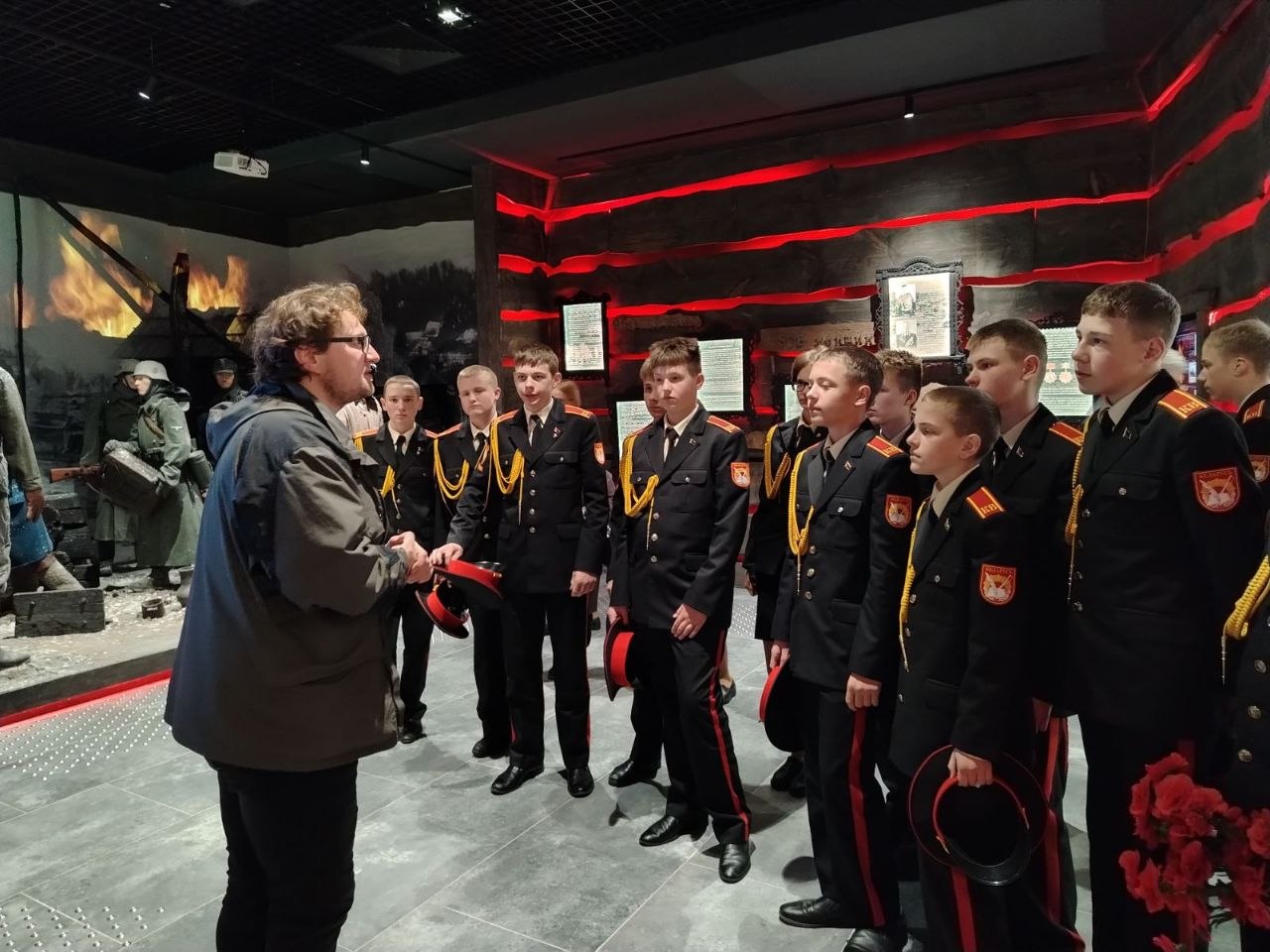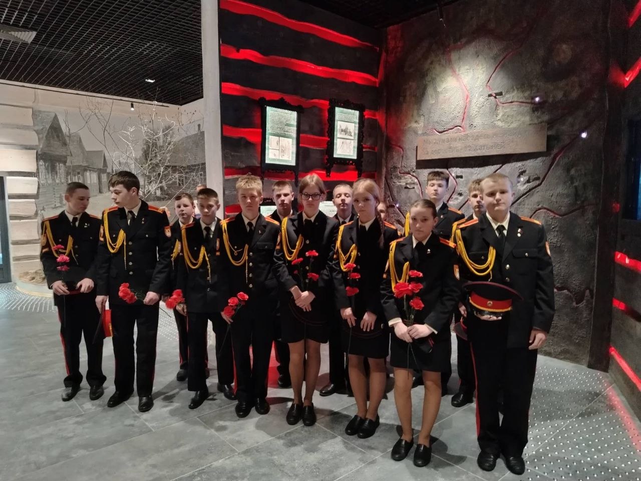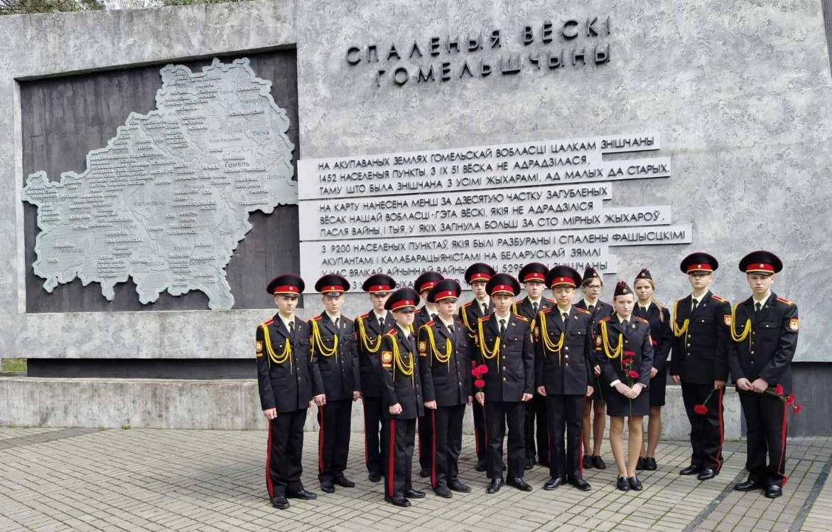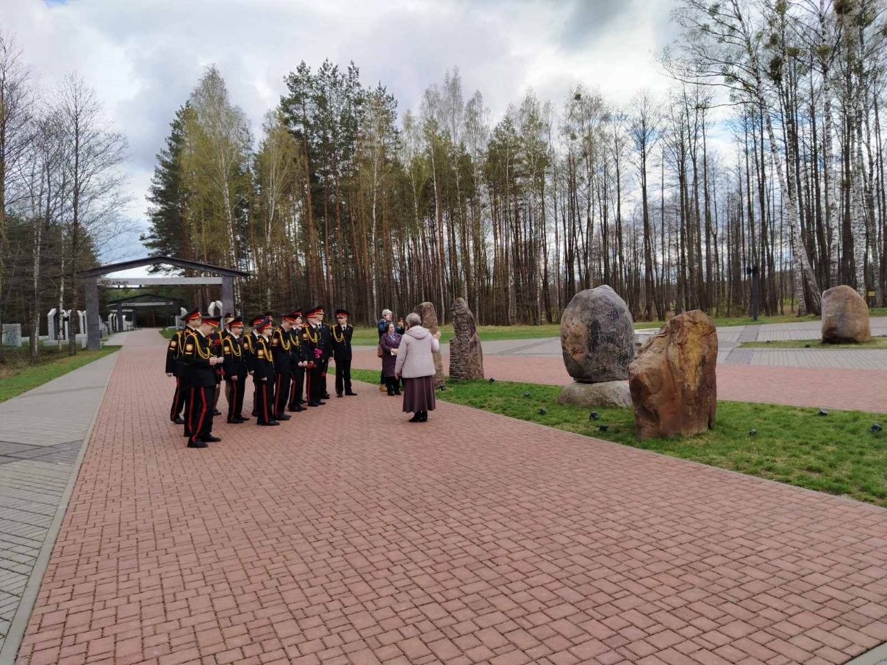 Прибыв к монументу, кадеты прошли по территории комплекса, архитектура которого производит неизгладимое впечатление. В центре мемориала установлена стела с колоколом и фигурами ангелов, а по периметру расположены символические венцы домов — напоминания о сожженных хатах. Особое внимание воспитанников привлекла аллея, ведущая к братской могиле, а также таблички с именами погибших. Ребята почтили память невинных жертв минутой молчания. Тишина, прерываемая лишь звоном колоколов и ветром в кронах деревьев, стала самым красноречивым ответом на вопрос «зачем помнить о войне». Кадеты возложили цветы к подножию мемориала. Экскурсововды рассказали кадетам о малоизвестных фактах карательных операций на территории Беларуси и о том, как поисковые отряды восстанавливают имена героев и жертв.