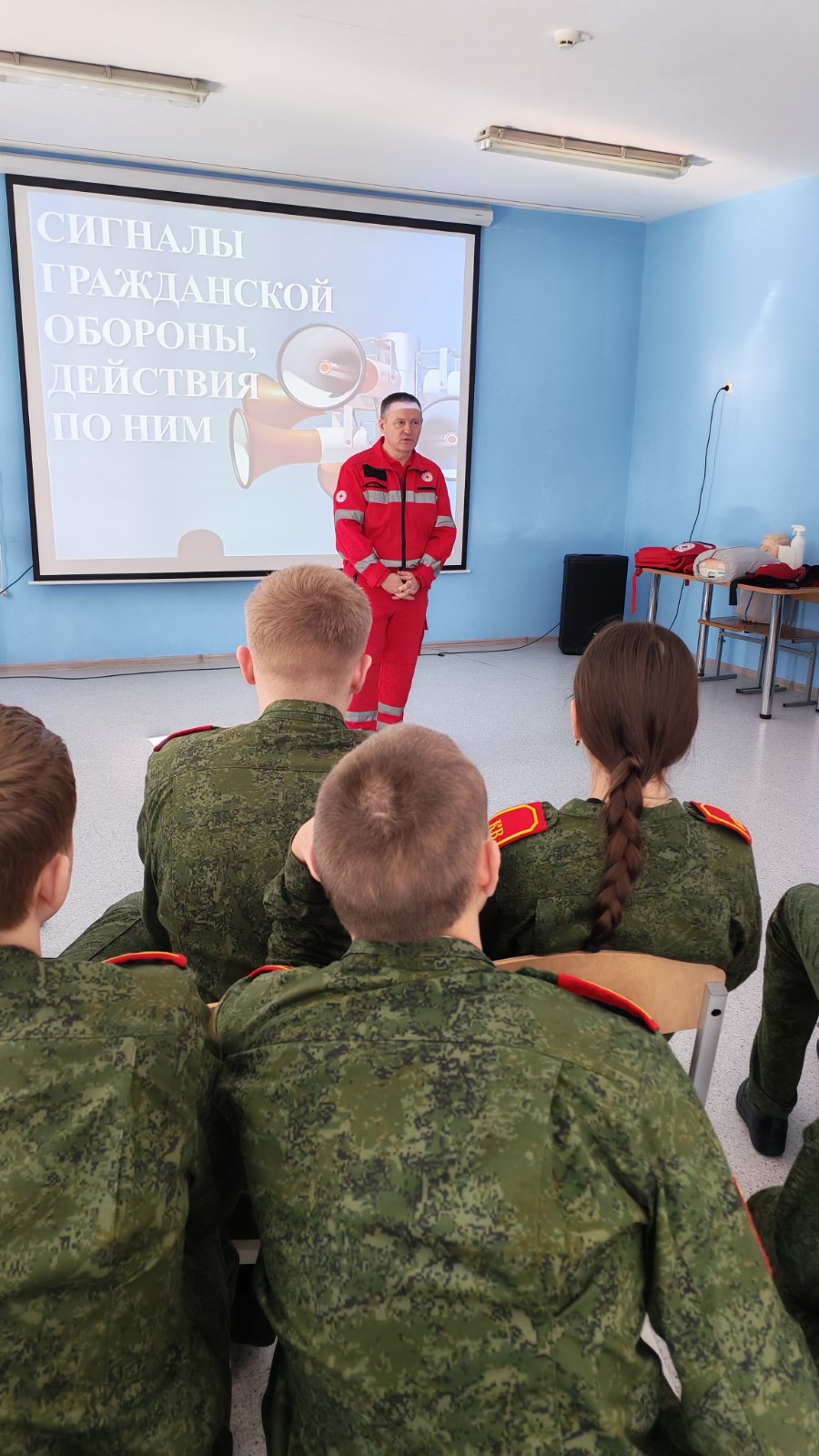 В начале встречи воспитатель Макаш Е.В. познакомила восьмиклассников с историей создания Международной организации гражданской обороны (МОГО). Ребята узнали о том, как зарождалась система защиты населения, какие задачи ставили перед собой первые службы спасения и как менялась структура ГО с течением времени. Особый интерес у кадет вызвало изучение основных сигналов гражданской обороны. Ребята разобрали алгоритм действий при сигналах «Внимание всем!», «Воздушная тревога», «Радиационная опасность» и других, а также узнали, как правильно вести себя в зависимости от полученной информации.