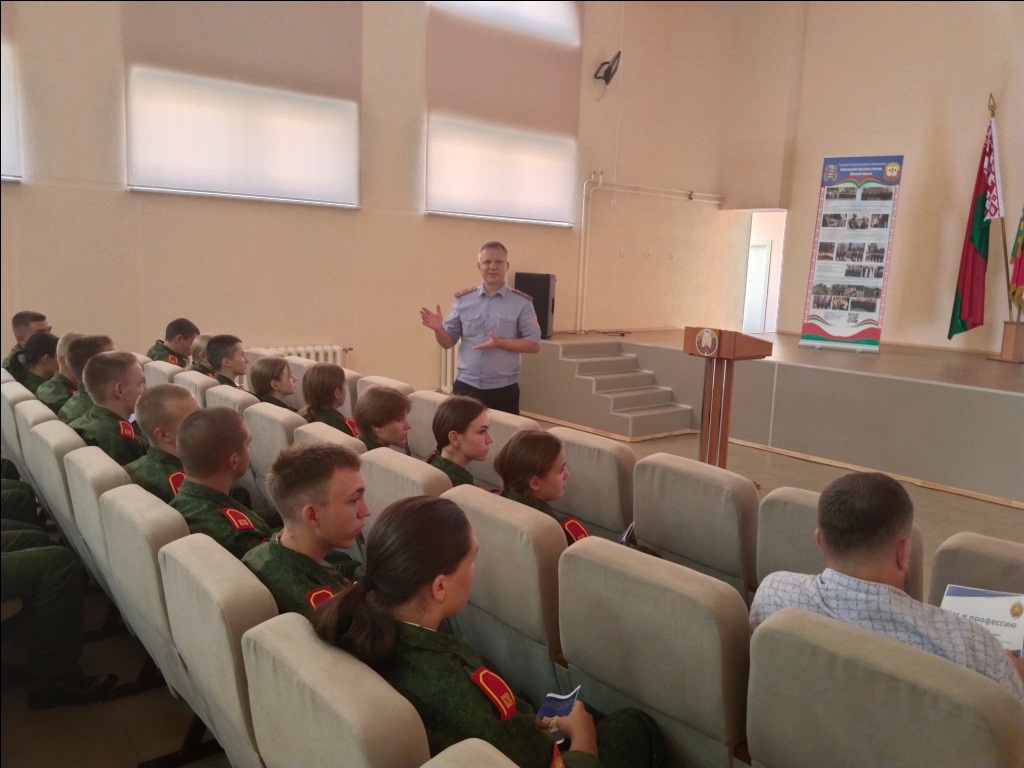 4 сентября 2024 года в ГУО «Борисовское кадетское училище Минской области» прошло профориентационное занятие для 10-11 классов, которое подготовили представители УВД Администрации Советского района г. Минска. Старший инспектор группы кадров Бушмак А.Ф., майор милиции Цуба А.М. рассказали кадетам о службе в органах внутренних дел, показали видеоролики соответствующей тематики.