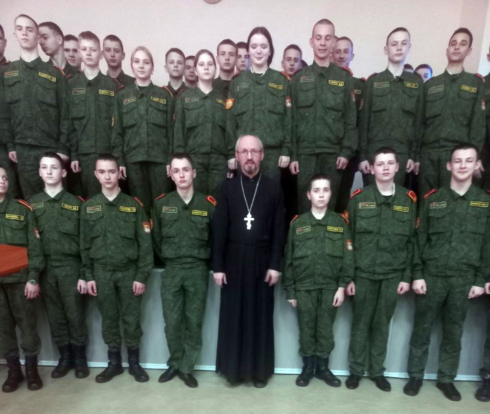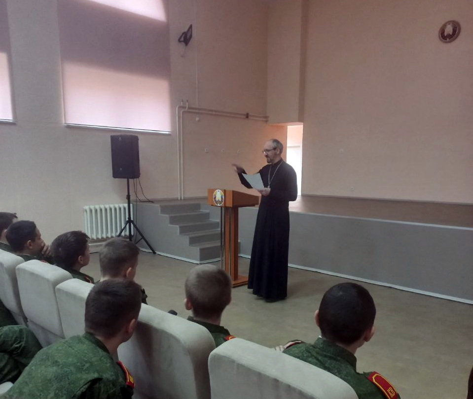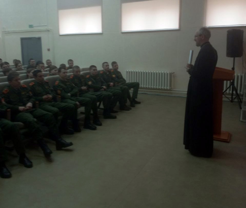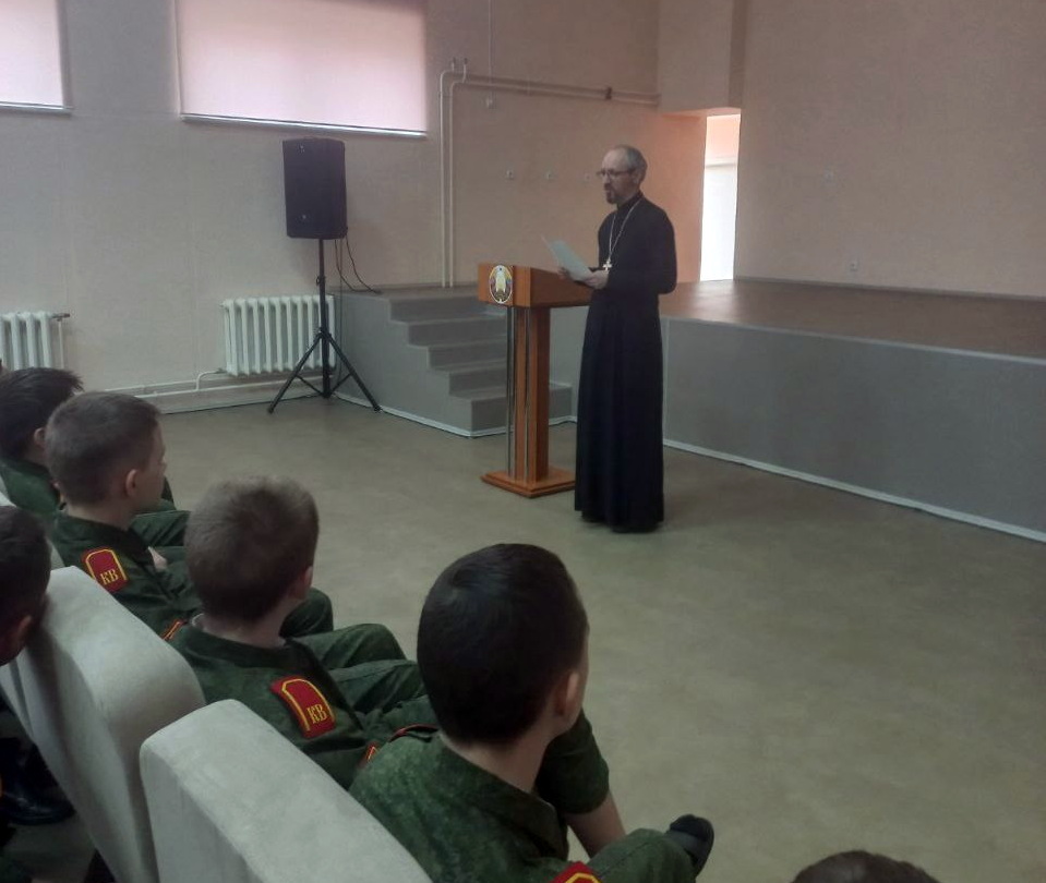 На простых и ярких примерах иерей Сергий объяснил кадетам православное понимание извечных вопросов человеческого бытия: что есть добро и зло, что такое совесть, какую роль она играет в жизни каждого человека. Рассказал ребятам о взаимоотношениях в семье, о том, что любовь к своим ближним нужно воспитывать, прежде всего, в семье.