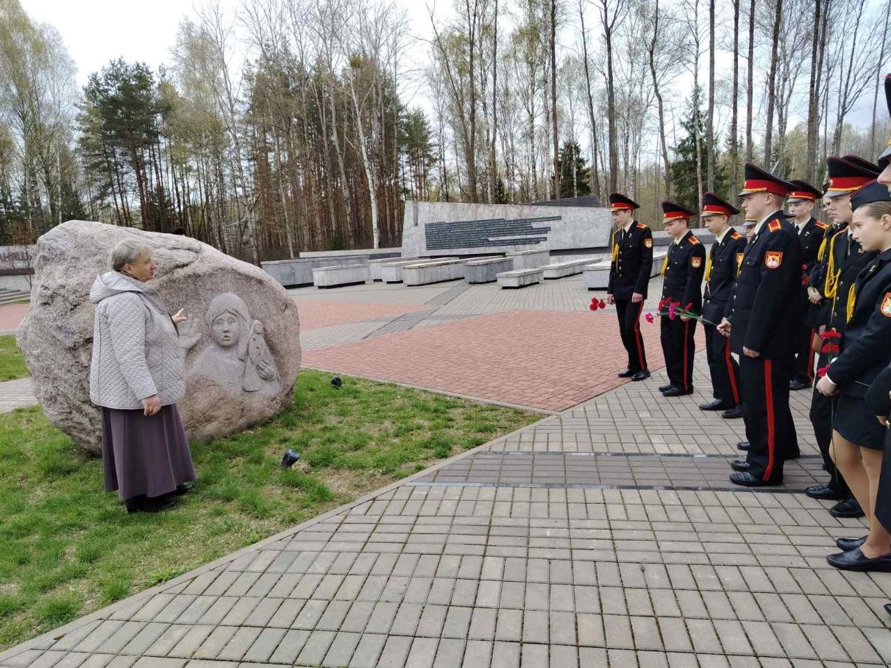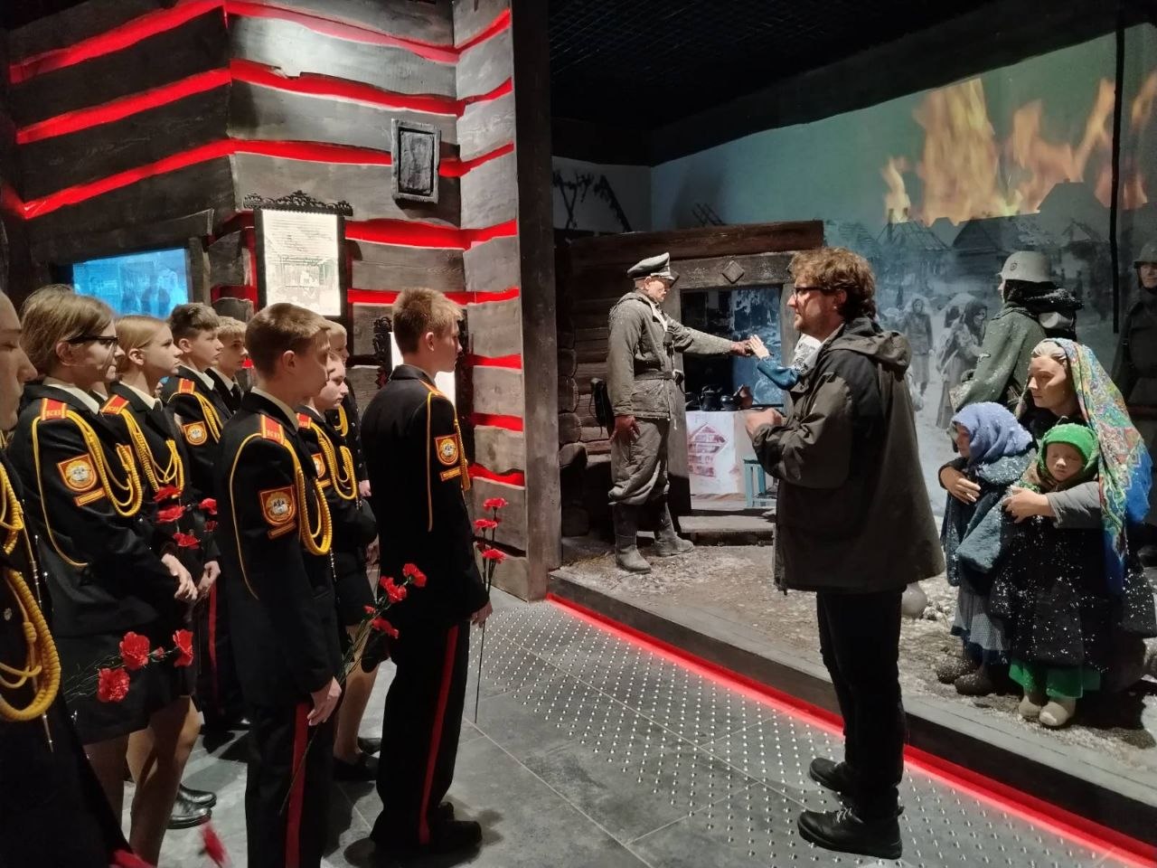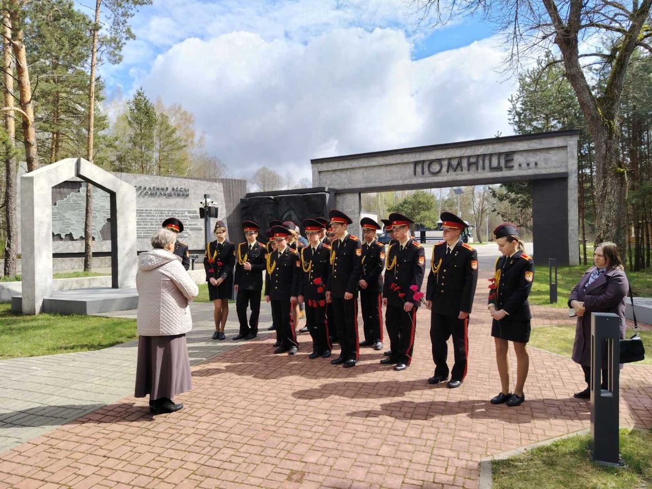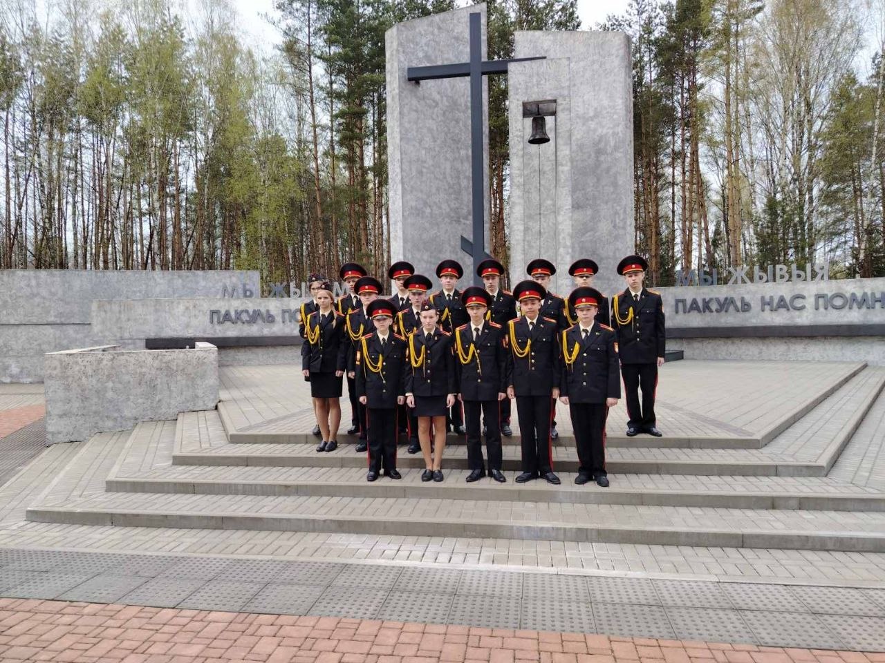 Прибыв к монументу, кадеты прошли по территории комплекса, архитектура которого производит неизгладимое впечатление. В центре мемориала установлена стела с колоколом и фигурами ангелов, а по периметру расположены символические венцы домов — напоминания о сожженных хатах. Особое внимание воспитанников привлекла аллея, ведущая к братской могиле, а также таблички с именами погибших. Ребята почтили память невинных жертв минутой молчания. Тишина, прерываемая лишь звоном колоколов и ветром в кронах деревьев, стала самым красноречивым ответом на вопрос «зачем помнить о войне». Кадеты возложили цветы к подножию мемориала. Экскурсововды рассказали кадетам о малоизвестных фактах карательных операций на территории Беларуси и о том, как поисковые отряды восстанавливают имена героев и жертв.